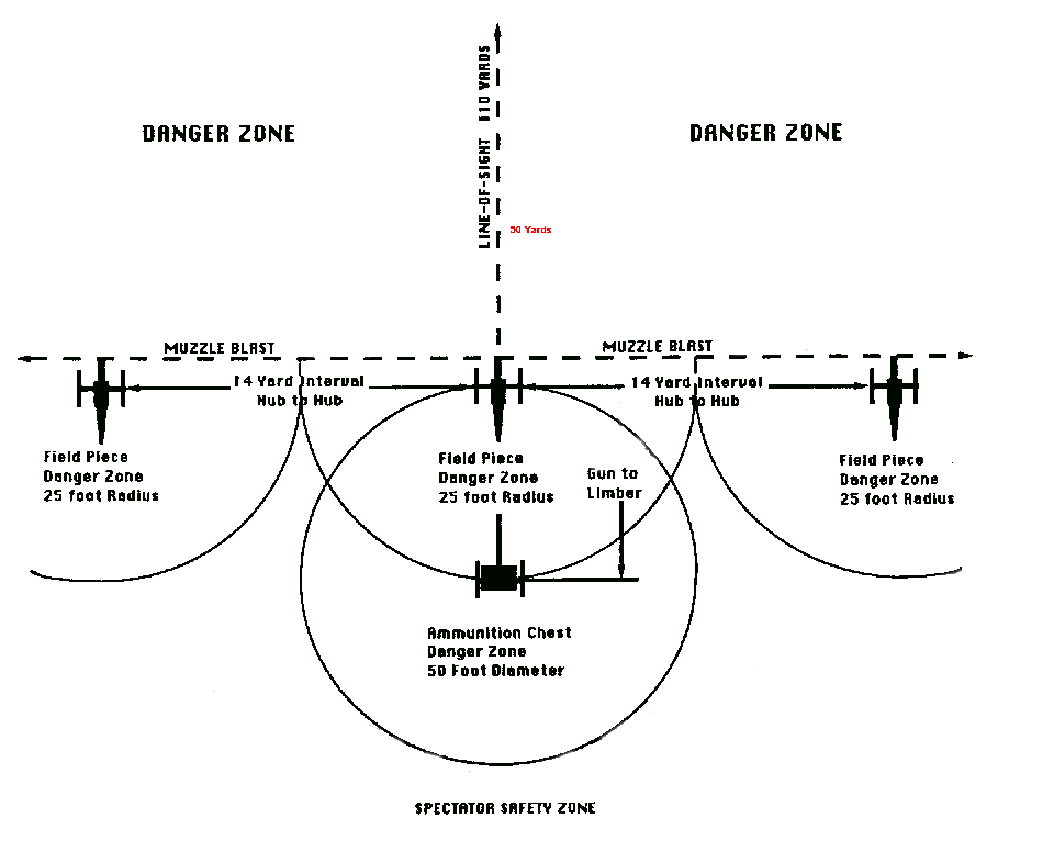 The blank cartridge (powder charge), when ignited in the field piece tube, throws a cone of flame 25 feet down range from the muzzle of the field gun. An accidental discharge with an object such as the rammer, the worm or a small solid piece of debris in the tube will throw fragments down range an unpredictable distance. The spent primer is launched upward in a column of flame as the field piece is fired. It sometimes comes down outside the danger zone.